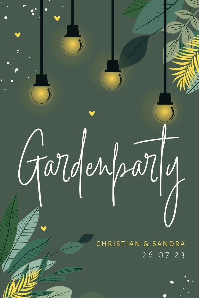 Vrolijke uitnodiging voor een gezellig tuinfeest: op de groene kaart staan brandende tuinlampjes en bladeren in geel en groen. De achterkant is wit en hier staan ook de feestverlichting en takken op. Hartjes en spetters maken het extra feestelijk, time to party!