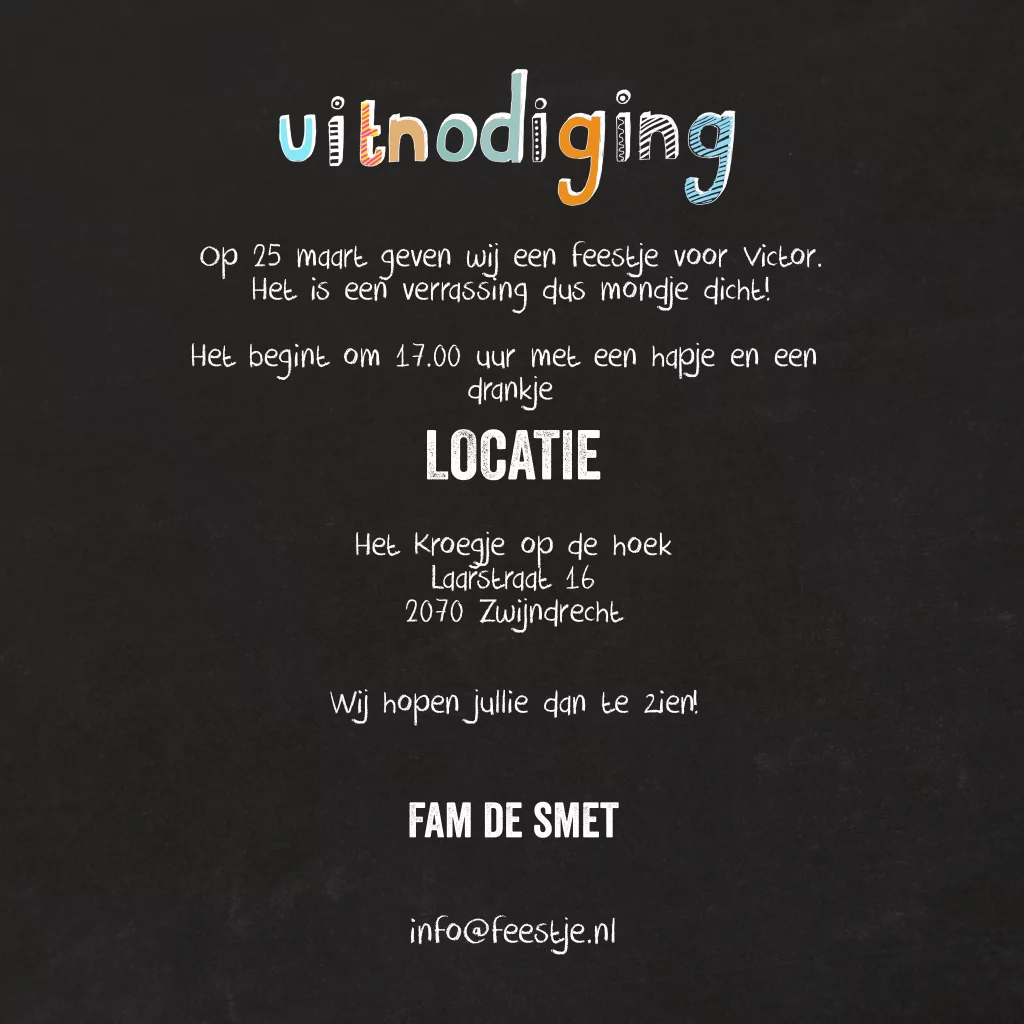 Feestje of surprise party omdat iemand Abraham heeft gezien? Deze verjaardagsuitnodiging met verschillende letters en tekeningen op een krijtbord achtergrond is perfect. Aan de binnenkant van de kaart kun je je eigen foto toevoegen, maak de kaart persoonlijk in de online editor.
