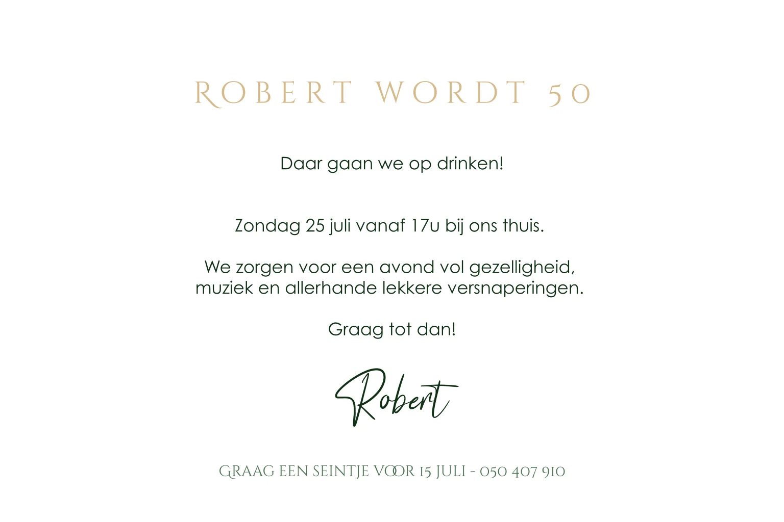 Chique verjaardagsuitnodiging in donkergroen met goudfolie cijfer vijftig in groen. Aan de binnenkant is ruimte om een eigen foto te uploaden, zo maak je een persoonlijke uitnodiging, pas de tekst naar wens aan in de online editor.
