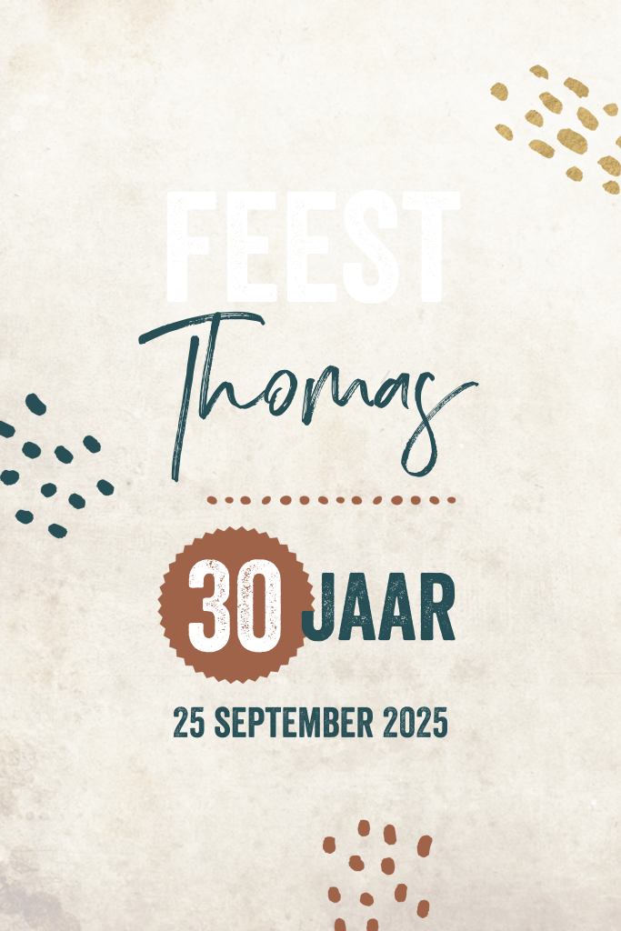 Trendy uitnodiging met abstracte elementen op een grunge-look achtergrond. De tekst "Feest" wordt in goudfolie gedrukt. Pas de tekst naar wens aan in de editor.
