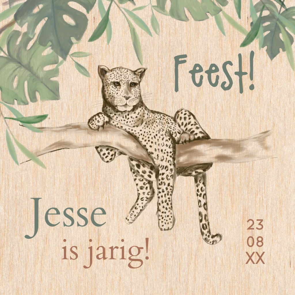 Een echt houten kaartje met jungle thema, een getekende panter voor een stoere en avontuurlijke jarige Job.