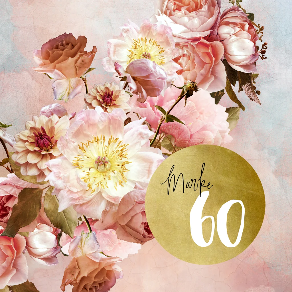 Mooie en chique uitnodiging voor een verjaardag met roze bloemen op een achtergrond van waterverf. Voor elke leeftijd te gebruiken want je kunt het jaartal eenvoudig aanpassen in de online editor.