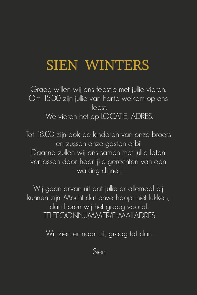 Hippe uitnodiging voor een 50ste verjaardag. In een geel lettertype staat groot 'Party' met grijze en gele confetti eromheen op een zwarte achtergrond. In de twee fotokaders kun je mooie foto's plaatsen voor een extra persoonlijke kaart. Pas ook eenvoudig zelf de tekst, de kleuren en het lettertype aan in de online editor.