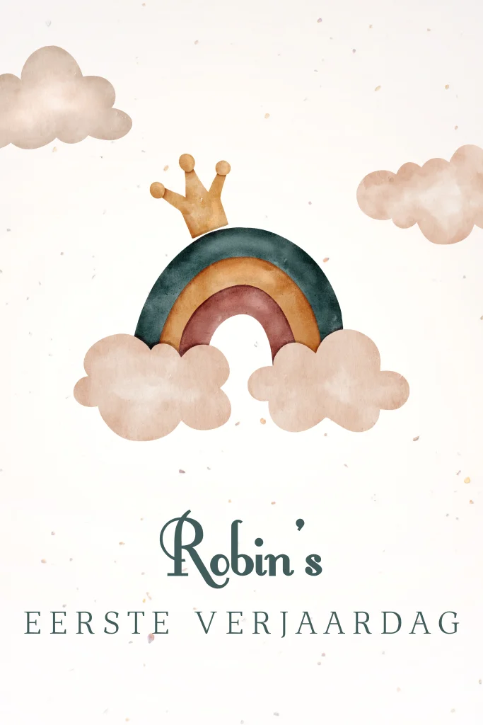 Vrolijke uitnodiging voor een kinderverjaardag met een regenboog in de wolken en een klein kroontje er bovenop.