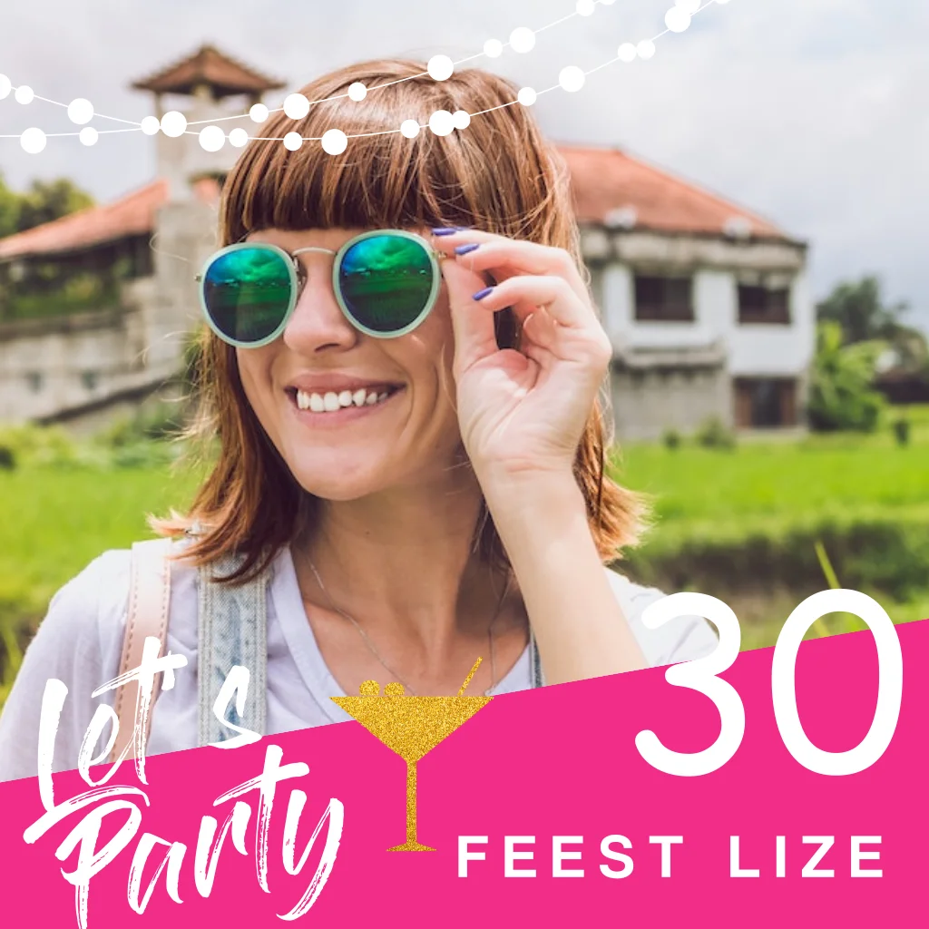 Vierkante verjaardagskaart met eigen foto, knalroze kleurvlak, cocktailglas en bolletjesslinger. Echt trendy! Leuk voor de 30e verjaardag van een vrouw. Maak hem zelf compleet met eigen teksten en foto in de online editor en kies een bijpassende enveloppe!