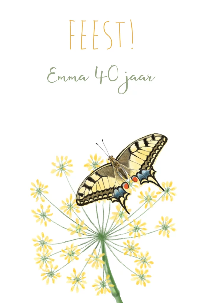 Een mooie, handgeschilderde verjaardags uitnodiging met Koninginnepage op bloem voor een 40 jarige. De uitnodiging kun je aanpassen naar elke leeftijd in de editor.