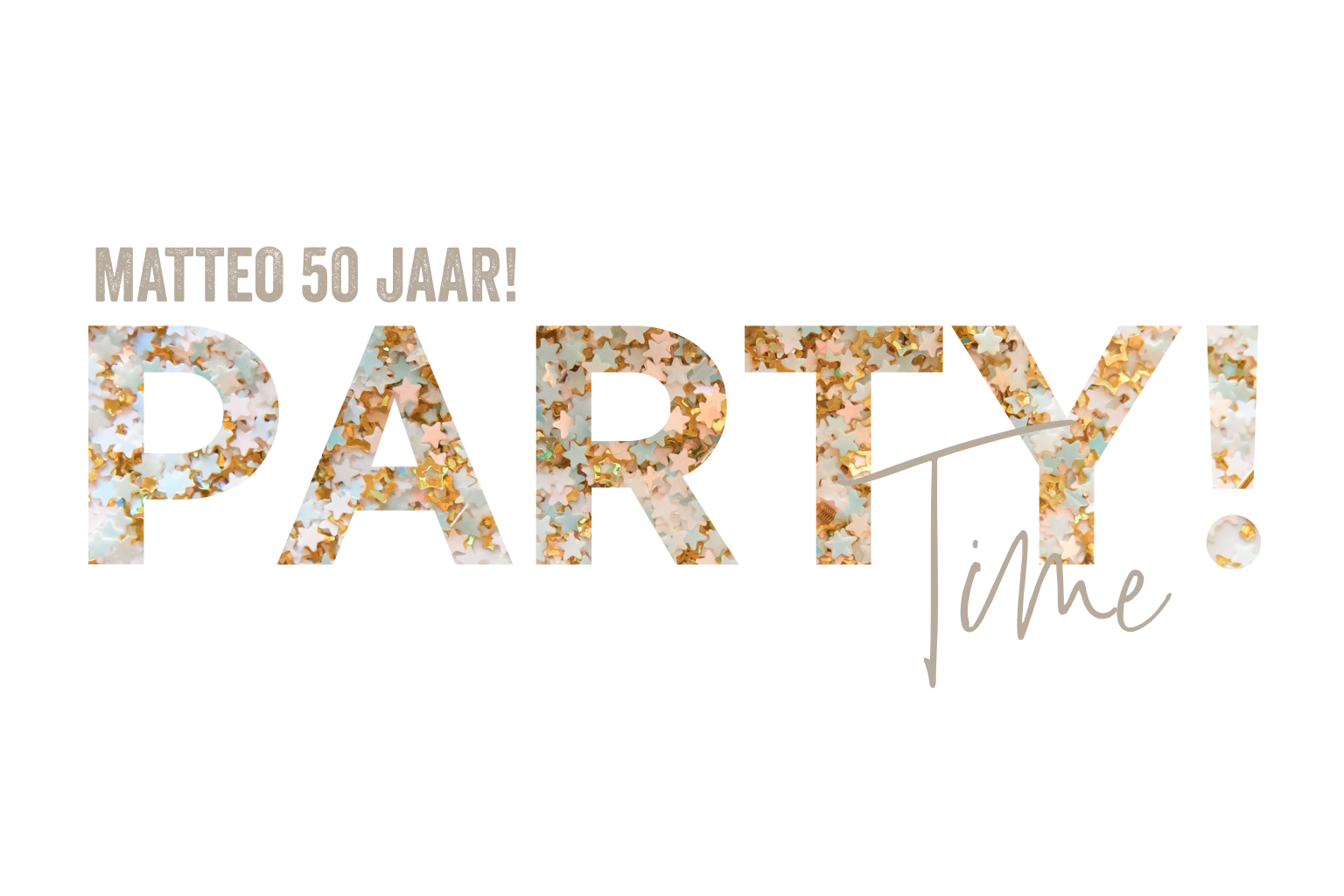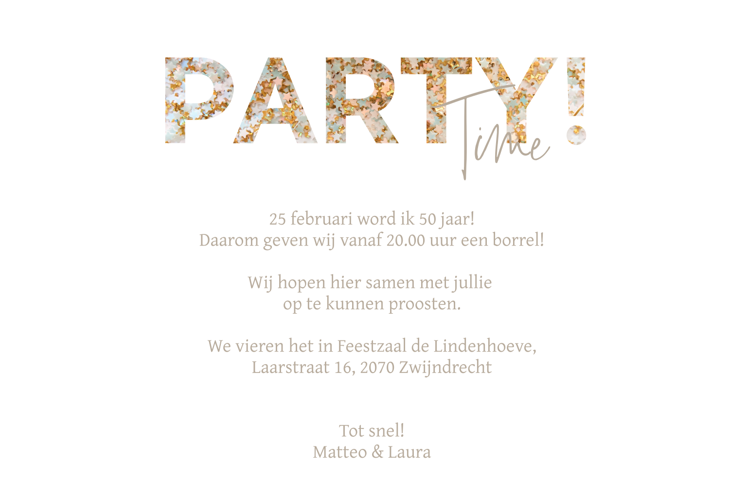 Vrolijke uitnodigingskaart voor je 50e verjaardag met ruimte voor eigen foto aan de binnenzijde. In de online editor kun je de kaart helemaal naar eigen wens aanpassen.