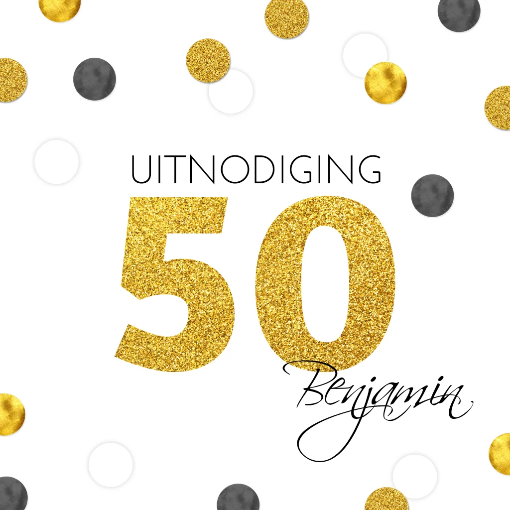 Hoera, 50 jaar! Stuur vrienden en familie deze chique en tegelijkertijd hippe uitnodiging met confetti en 50 groot in goudlook. Teksten en lettertypes zijn naar wens aan te passen. Maak hem zelf persoonlijk!