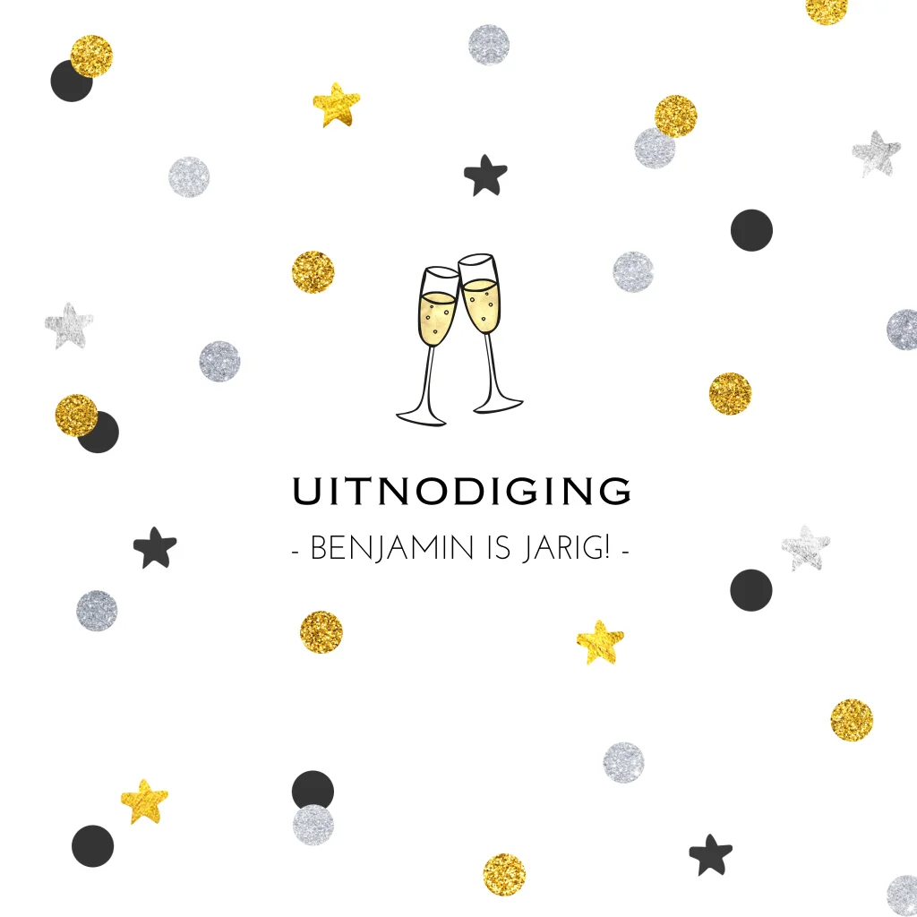 Organiseer jij een knalfeest voor jouw verjaardag? Stuur deze hippe kaart met confetti in zwart, zilver en goudlook naar je vrienden en familie. Met de feestelijke champagneglazen is hij helemaal af! Alleen nog even de tekst aanpassen in de editor en je uitnodiging is klaar om aan vrienden en familie te sturen!