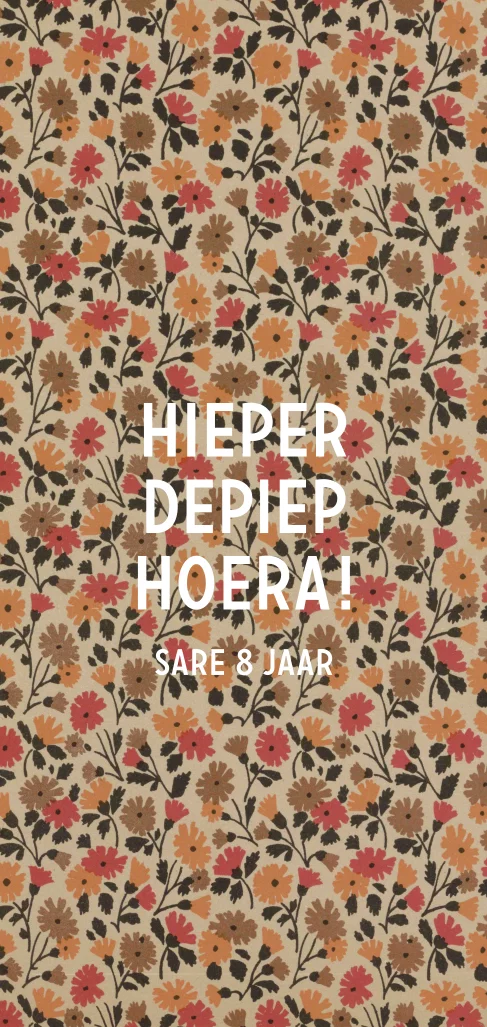 Een vrolijke verjaardagskaart met een patroon van kleurrijke bloemetjes op een beige achtergrond, de achterkant is effen beige. De tekst is in wit, pas deze naar wens aan in de online editor en nodig vriendjes en familie uit met deze leuke verjaardagskaart!