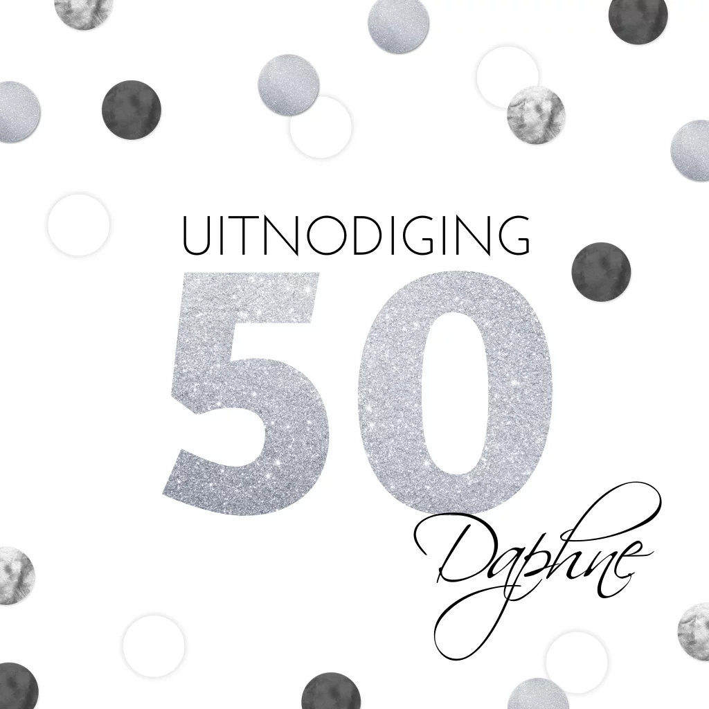 Uitnodigingskaart met confetti in zwart, wit en zilverkleur. Opvallend is de 50 in het midden! Maak dit stijlvolle kaartje compleet met eigen teksten in de editor en kies een bijpassende enveloppe.