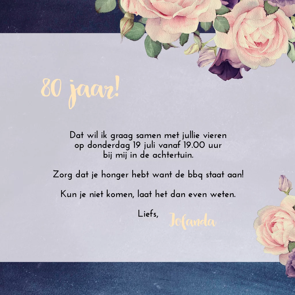 Stuur deze mooie verjaardagskaart met romantische rozen om vrienden en familie uit te nodigen voor je 80e verjaardag. De teksten, kleuren en lettertypes zijn eenvoudig aan te passen in de editor, deze kaart is dus ook te gebruiken voor andere leeftijden!