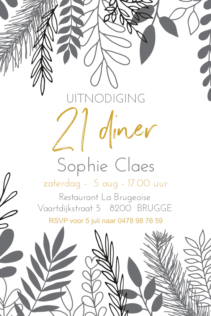 Een originele uitnodiging voor jouw 21 diner. Op de witte achtergrond zijn stijlvolle zwart-witte takjes met mooie bladeren te zien. Een deel van de tekst midden op de kaart is goud gekleurd.