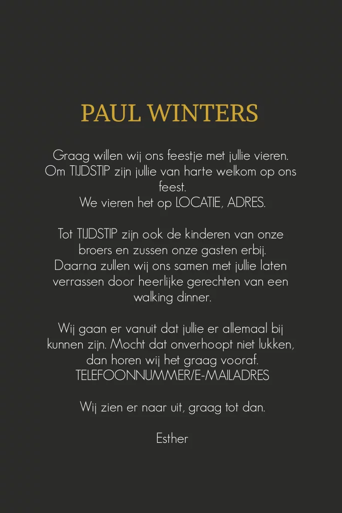 Op deze met takjes gedecoreerde uitnodiging voor je verjaardag wordt meteen alle belangrijke informatie duidelijk voor de gasten. Deze pas je gemakkelijk aan in de editor. De twee foto's van jezelf maken de kaart super persoonlijk.