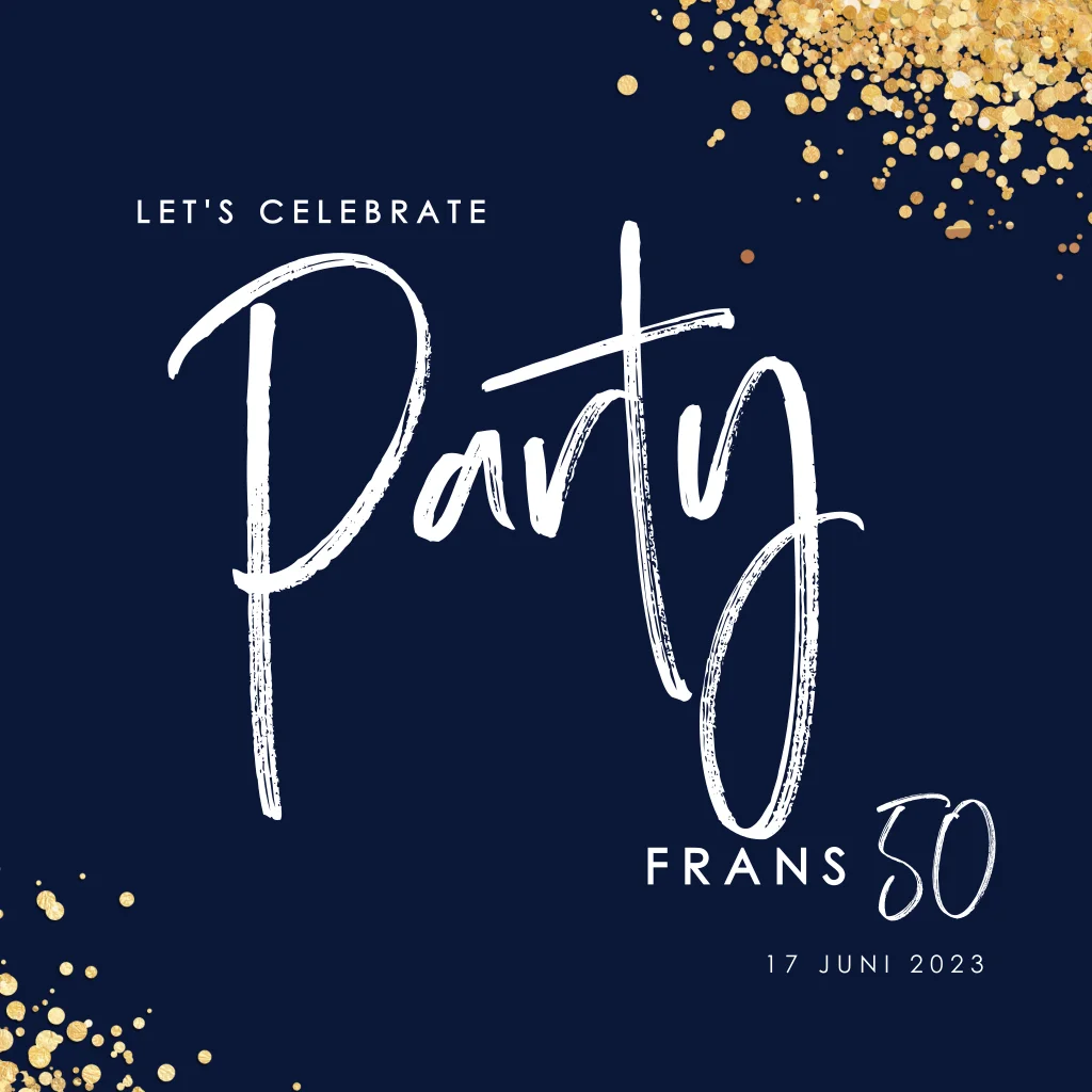 Feestelijke uitnodigingskaart met gouden confetti op een donkerblauwe achtergrond! De tekst kan gemakkelijk in de editor worden aangepast.