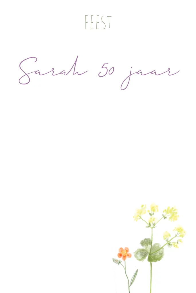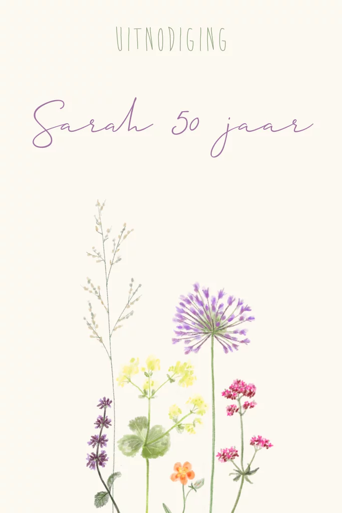 Bloemrijke uitnodiging voor de 50e verjaardag van een vrouw, met onderaan een kleurrijke rand met veldbloemen. Aan de binnenkant zijn ook veldbloemen te vinden bij de tekst, die in bijpassend groen en lila is. Pas zelf de teksten aan in de online editor en maak de kaart geheel naar eigen wens.
