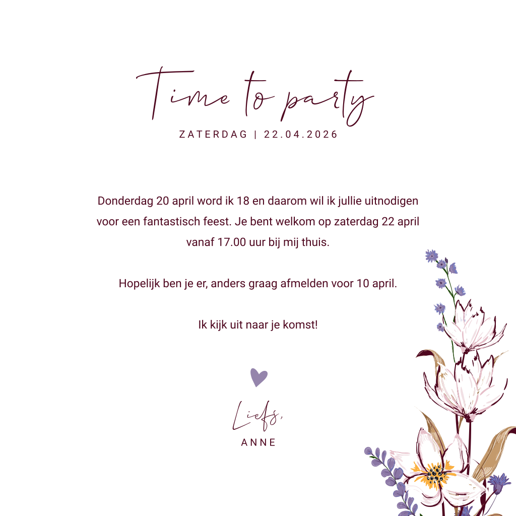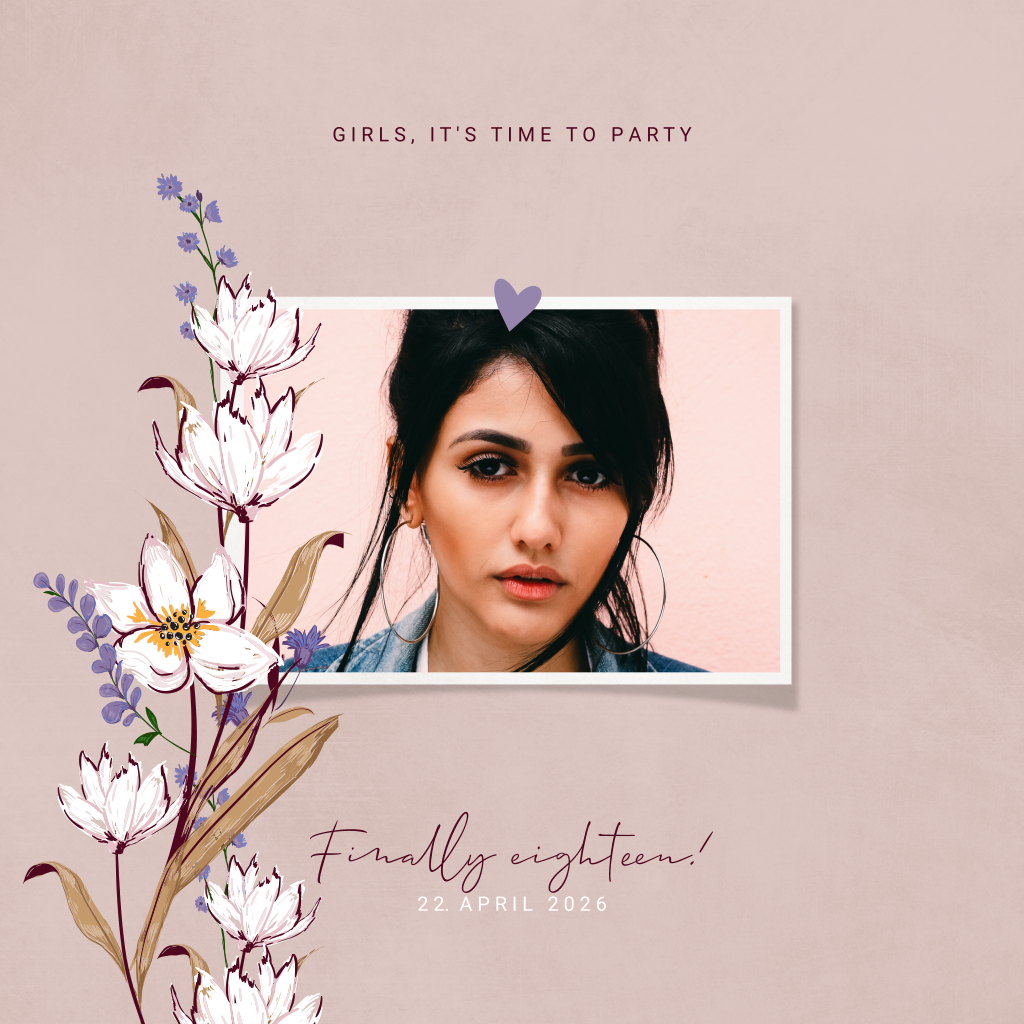Mooie uitnodigingskaart voor een verjaardag in roze velvetlook met een mooi bloemendesign in paars en wit. Op de voorkant is ruimte voor een eigen foto, het bloemendesign komt ook aan de roze witte binnenkant terug met een bijpassend hartje.