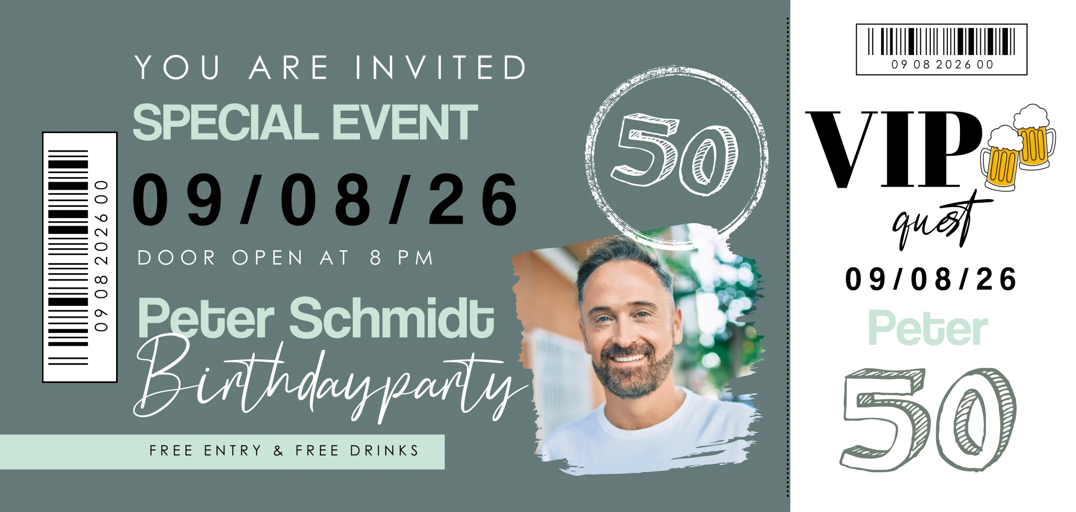 Originele uitnodiging voor een 50ste verjaardag van een man in de vorm van een VIP ticket. De tekst op de grijsgroen met witte kaart staat in mintgroen, zwart en wit en is in verschillende lettertypes. Op de voorkant kun je een leuke foto uploaden, op de achterkant staan klinkende bierpullen, tijd voor een feestje! Bewerk de kaart naar je eigen wensen in onze editor en bestel een proefdruk.