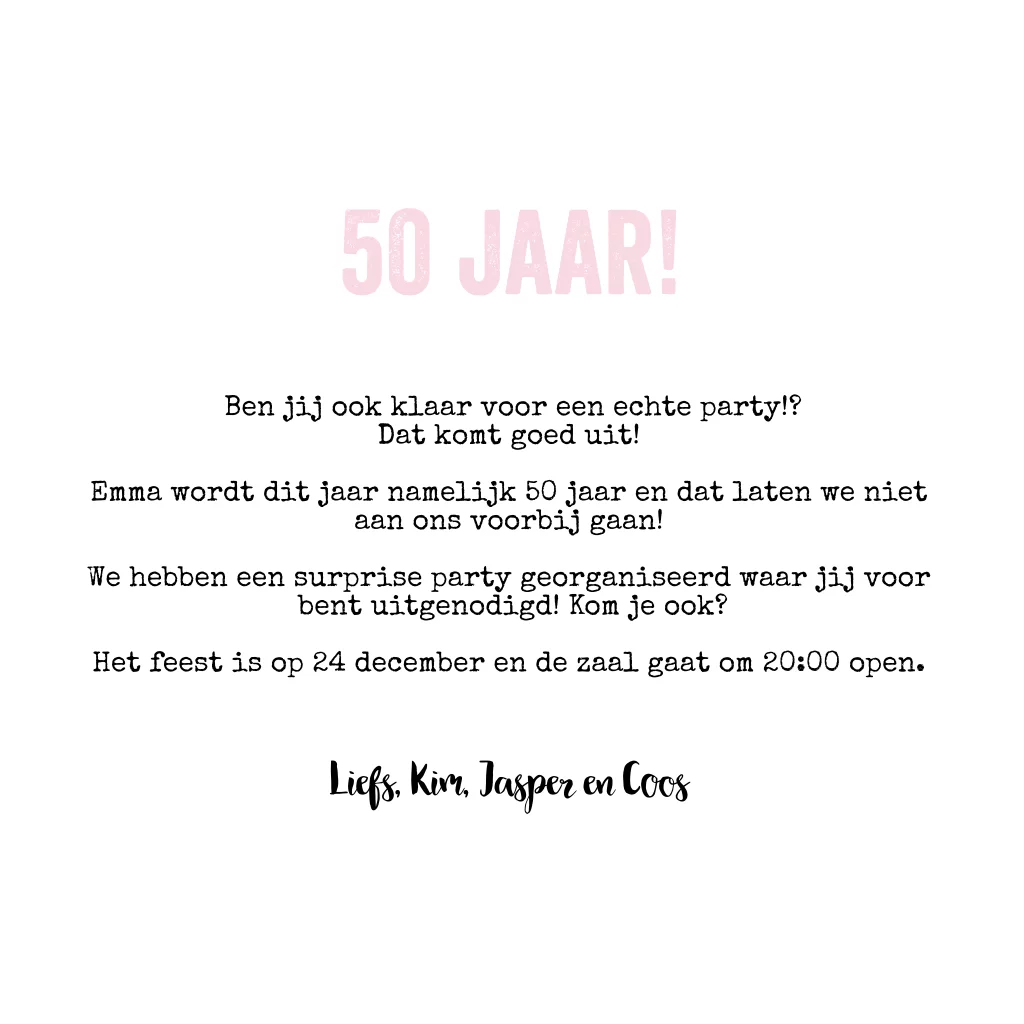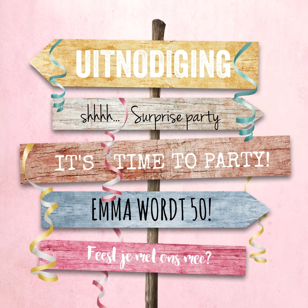 Vrolijke uitnodiging surprise party voor de 50ste verjaardag van een vrouw, met wegwijzer in vrolijke kleuren. In de online editor kun je eenvoudig het ontwerp aanpassen naar eigen wens.