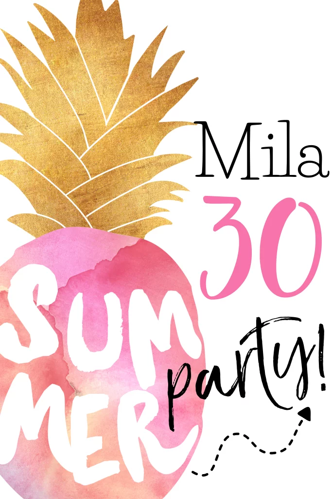 Tropische 30 jaar uitnodiging met een ananas in de kleuren roze en goud. De kleuren en teksten kunnen in de editor worden aangepast.
