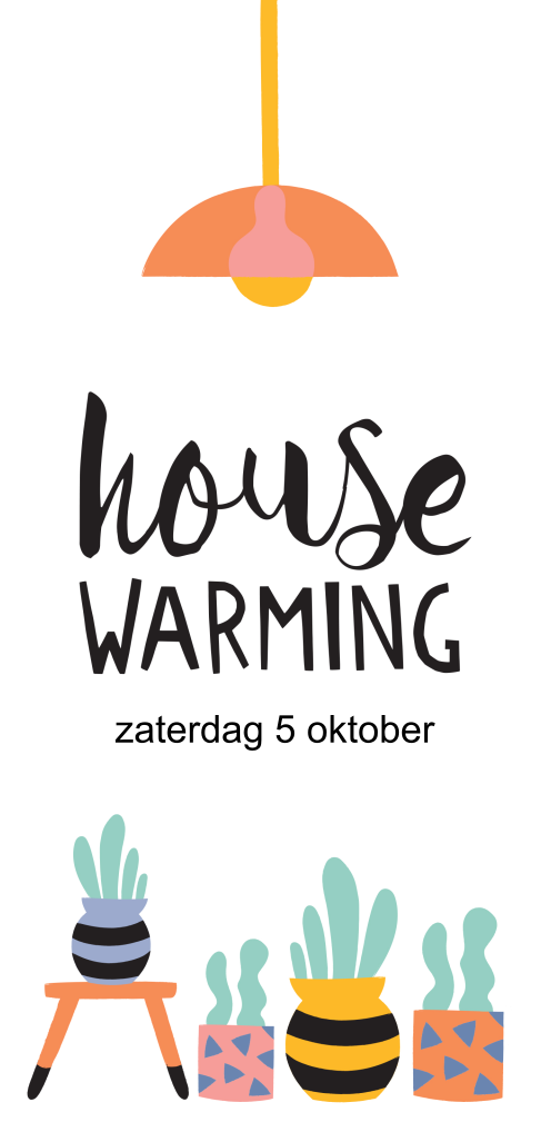 Hip kaartje voor een houswarming met vrolijk gekleurde illustraties van een hanglamp en cactussen in potten. De zwarte letters passen helemaal bij de tekeningen! Pas de teksten op het kaartje naar wens aan in de online editor.
