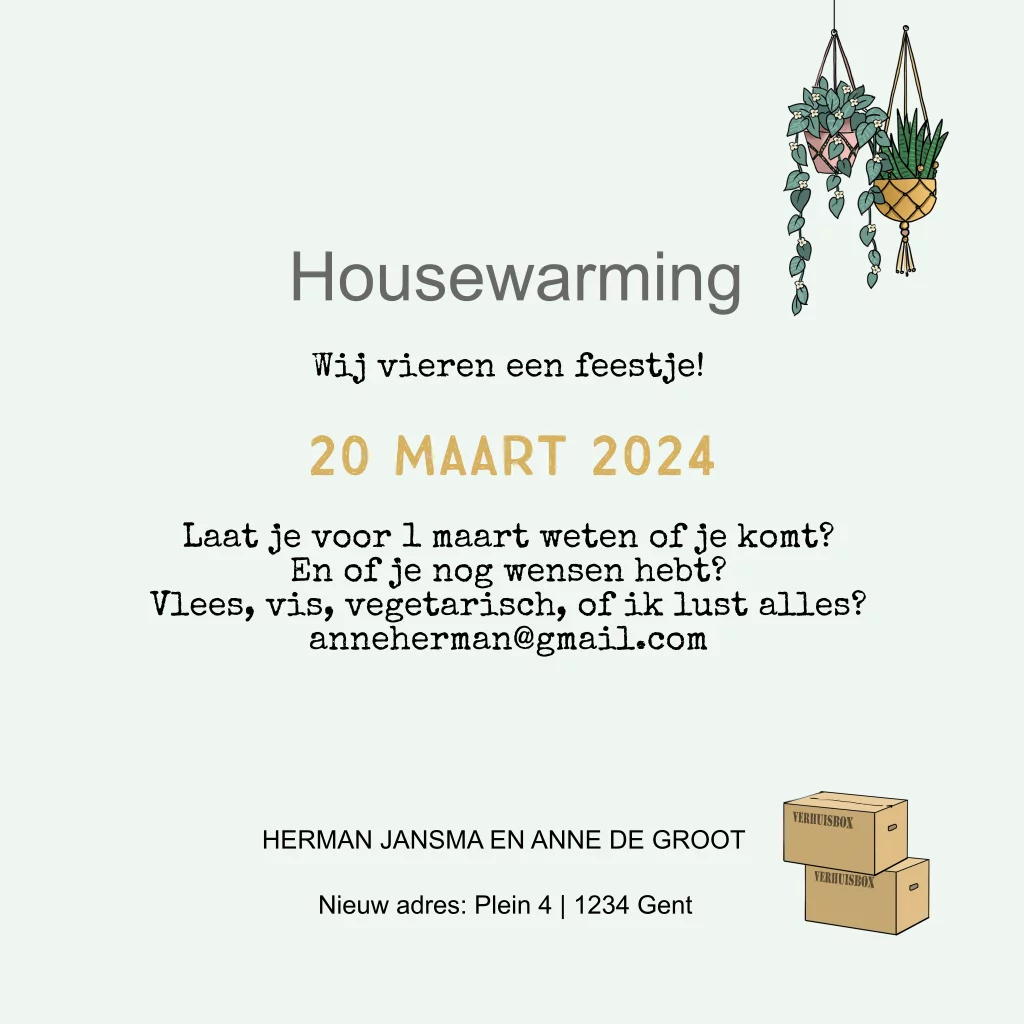 Housewarming/verhuiskaart met illustratie van dozen en planten