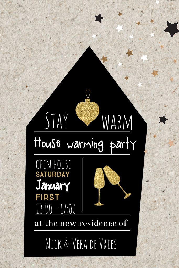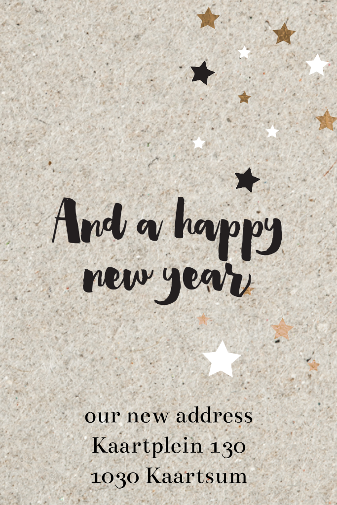 Een vrolijke kerst-verhuiskaart met verschillende sterren. De staande kaart heeft een huisje op de voorkant met verschillende lettertypes. In onze online editor kun je kiezen uit verschillende kleuren en extra versieringen om deze kaart volledig naar eigen wens te maken.