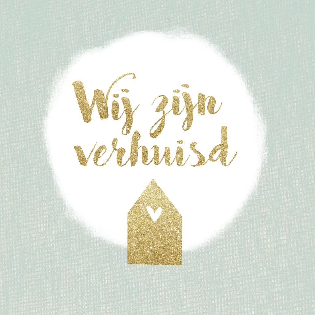 Hip kaartje om te laten weten dat jullie verhuisd zijn. Met een mintgroene achtergrond, witte verf stip en goudkleurige letters en huisje. De tekst op de achterkant van de kaart pas je gemakkelijk zelf aan in de online editor.