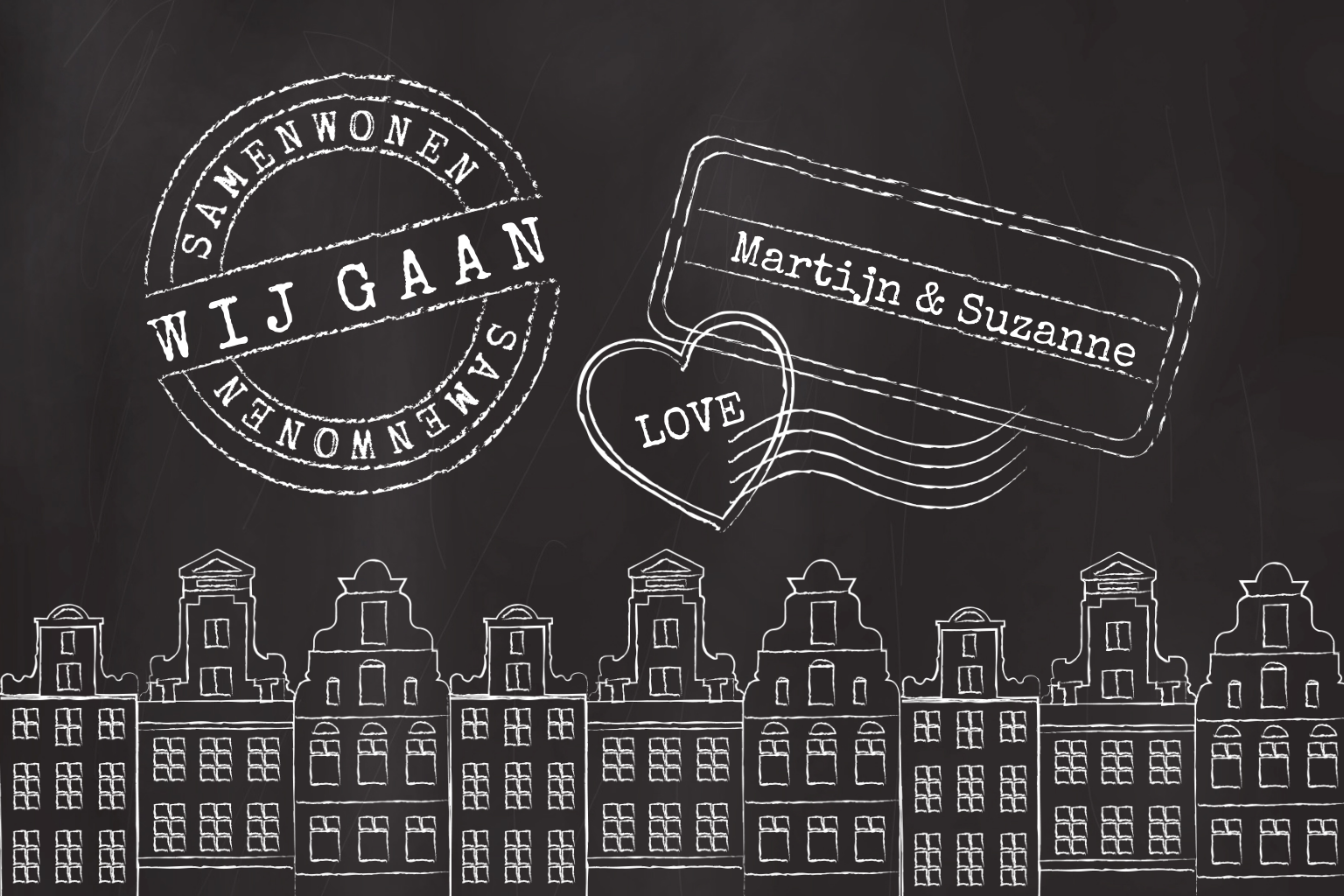 Op deze verhuiskaart met de achtergrond van een krijtbord staat een leuk getekende huizenrij in wit. Erboven staan stempels met tekst, personaliseer deze kaart in de online editor.