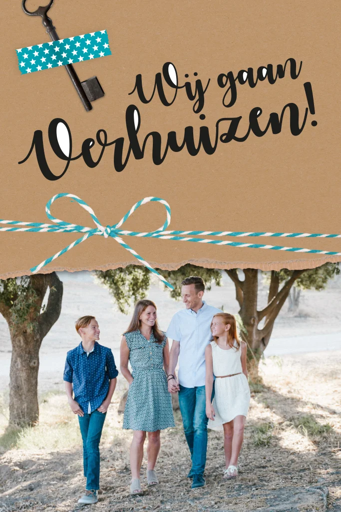 Gaan jullie binnenkort verhuizen? Verstuur deze stoere verhuiskaart naar vrienden en familie om jullie nieuwe adres door te geven! Het lijkt alsof het kaartje van kraft papier is ingepakt met een blauwwit touwtje. De nieuwe sleutel is erop geplakt met hip sterretjestape. Zet op de voorkant een foto van jullie gezin bij jullie nieuwe huis zodat iedereen weet waar je gaat wonen! In de online pas je het kaartje helemaal naar wens aan.