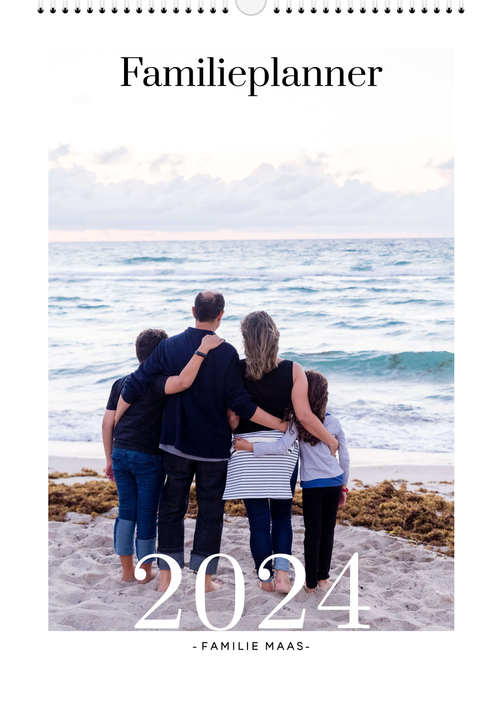 Op deze familieplanner is ruimte voor veel eigen foto's op de voorkant en bij iedere maand. De maanden zijn grijs omrand.