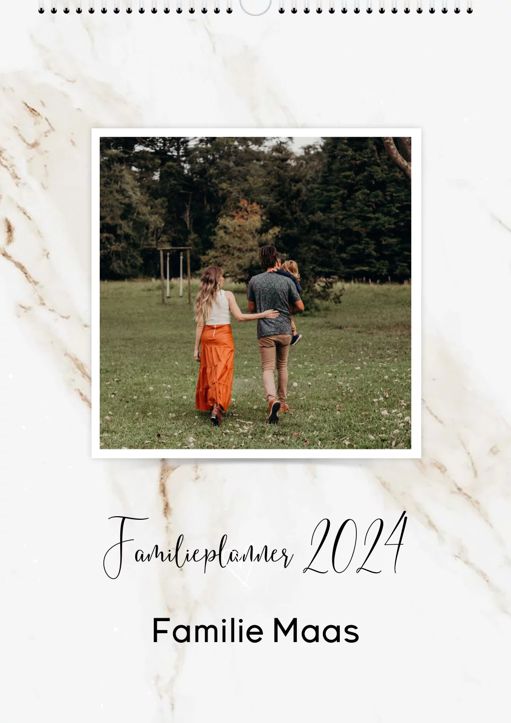 Maak een persoonlijke familieplanner met dit marmerlook design. Op de voorkant en bij de maanden is ruimte om eigen foto's te uploaden in de online editor, klik op het uploadsymbool om de foto's te vervangen.