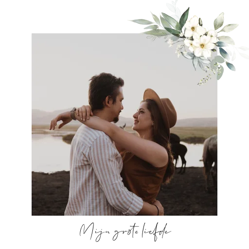 Vereeuwig jullie mooiste foto op een keramiek tegeltje als aandenken aan jullie trouwdag. Naast de foto op dit tegeltje staat een toef witte bloemen, eronder kun je de gewenste tekst plaatsen in de online editor.