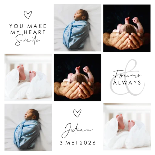 Leg de mooiste foto's van jullie kleine vast op een tegeltje, origineel! Op dit tegeltje is plaats voor 6 foto's, afgewisseld met drie vakken waar een persoonlijke tekst ingezet kan worden, de kleine hartjes zijn een leuk accent. Upload de mooiste foto's en maak het tegeltje persoonlijk in de online editor, ook leuk als cadeautje voor opa en oma!