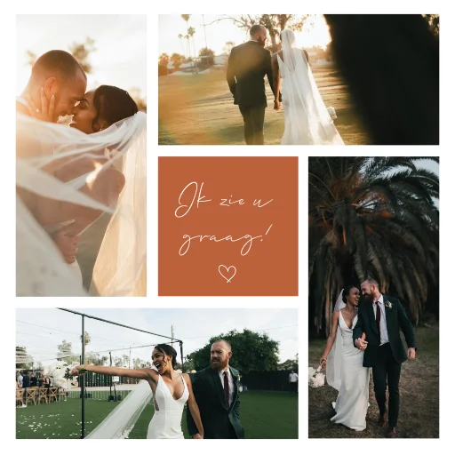 Stel een mooie fotocollage samen op dit keramiek tegeltje, een leuk aandenken aan jullie trouwdag! Op dit tegeltje is ruimte voor vier foto's met in het midden een roestbruin vlak, hier kun je eigen tekst invoegen.